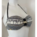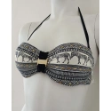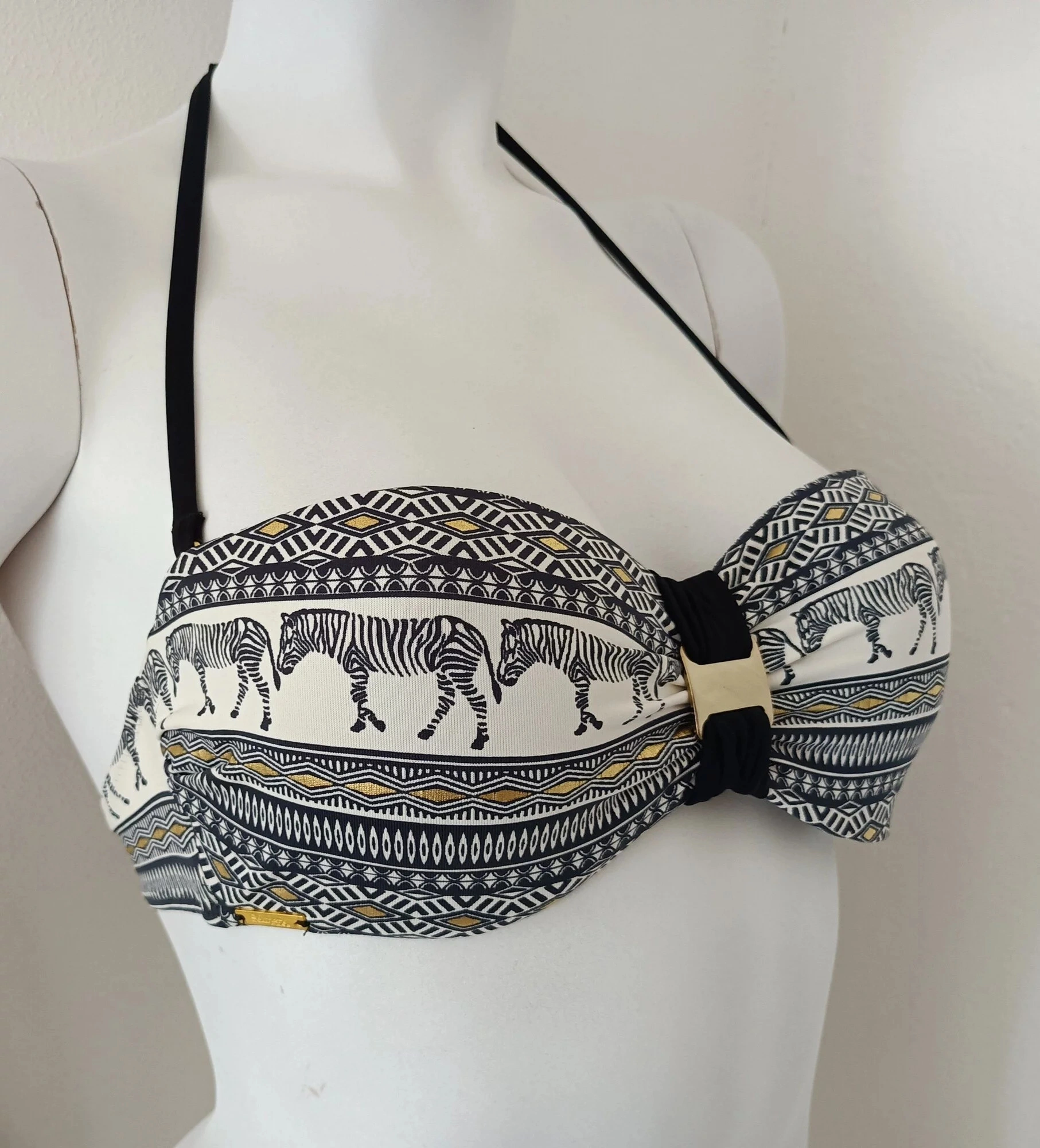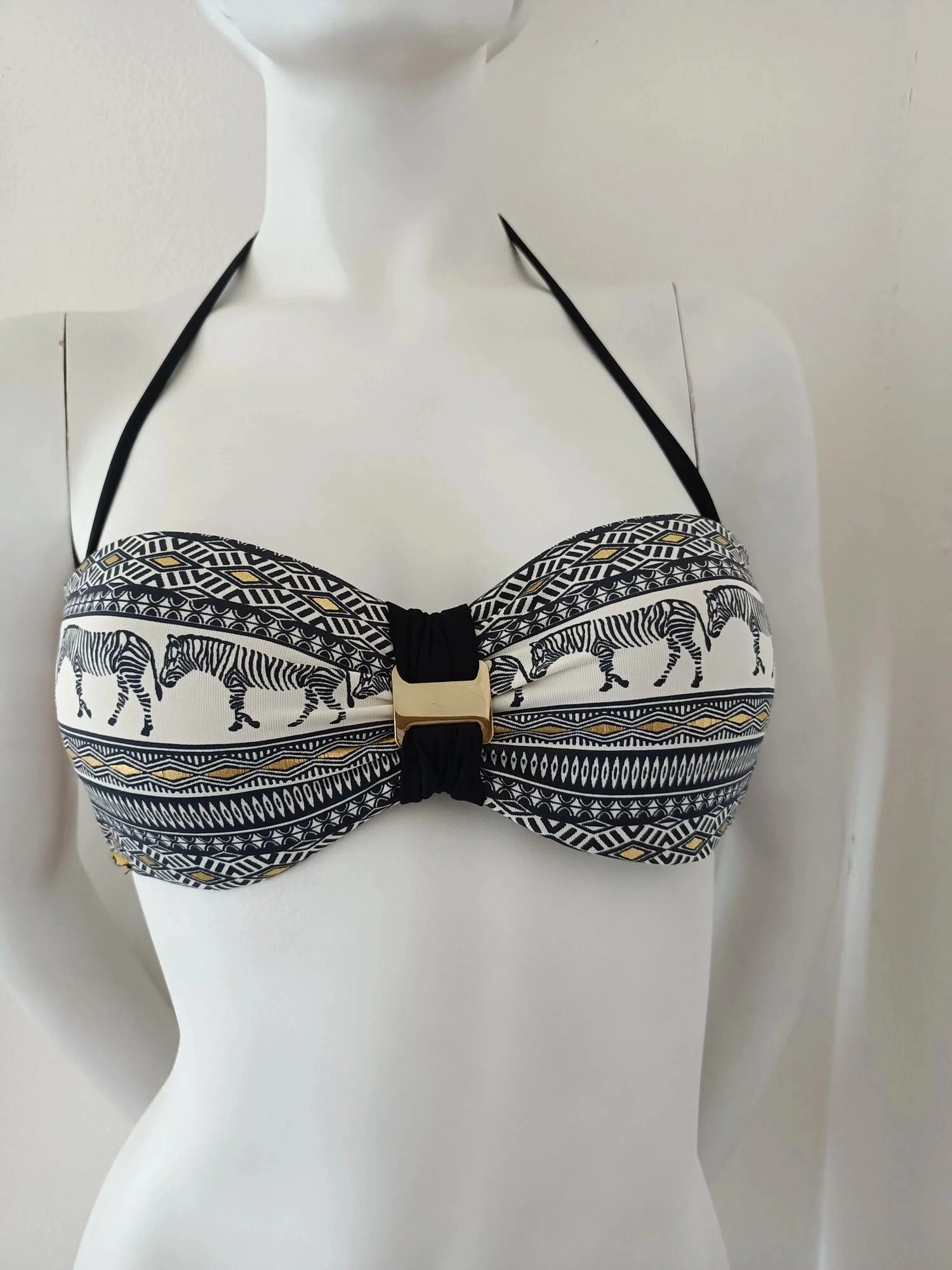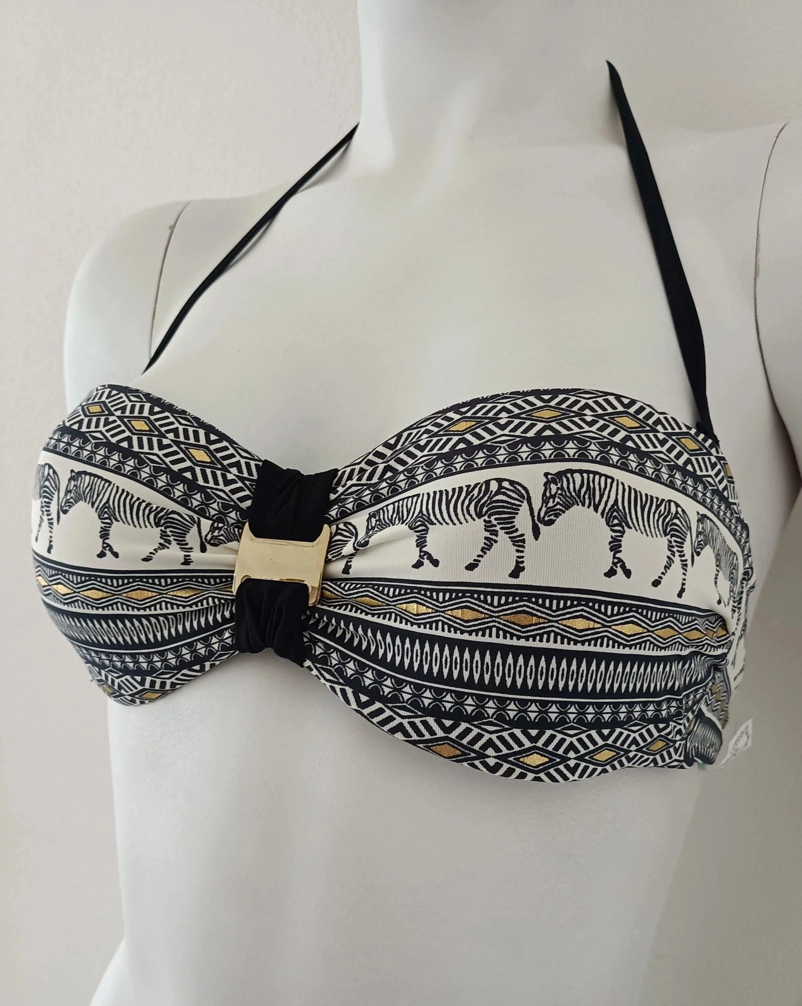 Damski top kąpielowy z nadrukiem zebry i złotymi elementami.
