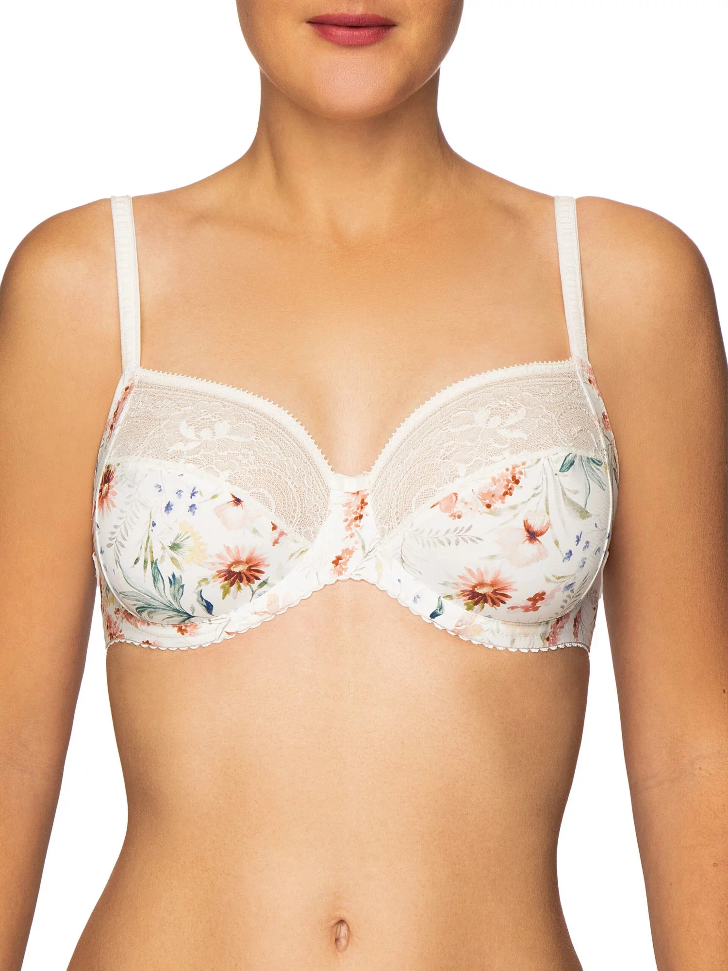 Glorious Lea, bujna kwiatowa łąka z kobiecą i delikatną koronką. Drobna siateczka i ozdobne tasiemki w połączeniu z letnim kwiatowym nadrukiem w kolorze "Blossom Cream" tworzą zwiewną bieliznę marzeń.Biustonosz jest usztywniany i nie posiada wzmocnień.