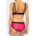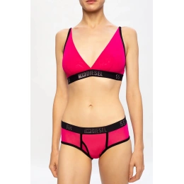 Różowy biustonosz marki Diesel. Ten model jest wykończony regulowanymi ramiączkami i elastycznym pasem ozdobionym logo inkrustowanym srebrną i lureksową przędzą.