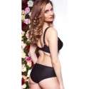 Półusztywniany biustonosz. Góra miseczki wykonana z pięknego haftu, dół miseczki wzmocniony, gładki, pokryty czarną mikrofibrą. Urocza satynowa kokardka między miseczkami. Nieodpinane, regulowane paski naramienne o szerokości stopniowanej w zależności od rozmiaru (12 mm, 16 mm, 22 mm). Zapięcie na haftki z tyłu z trzystopniową regulacją (dwu- lub trzyrzędową, w zależności od rozmiaru).