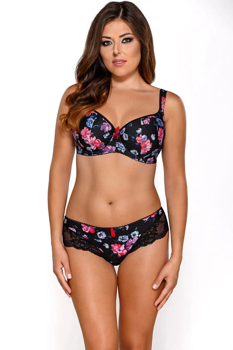 Damski biustonosz balkonetka wykonany z kwiecistego materiału na czarnym tle. Podkreśla kobiece atuty. Paski są regulowane i nie można ich odpiąć. Możliwość zakupu stringów i majtek.