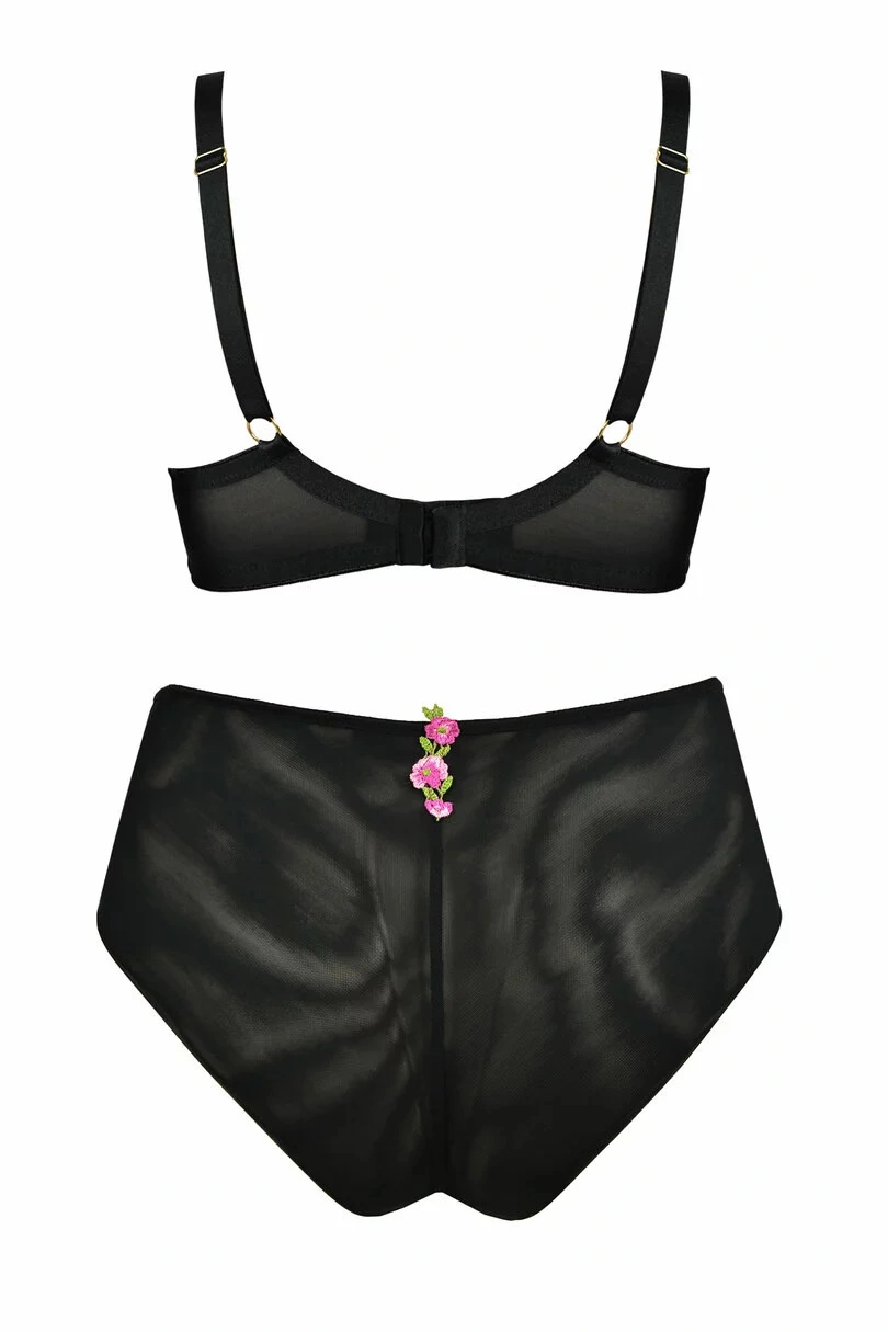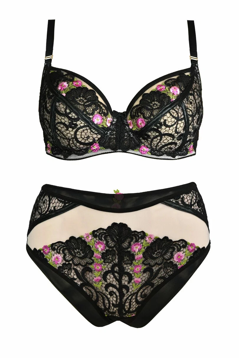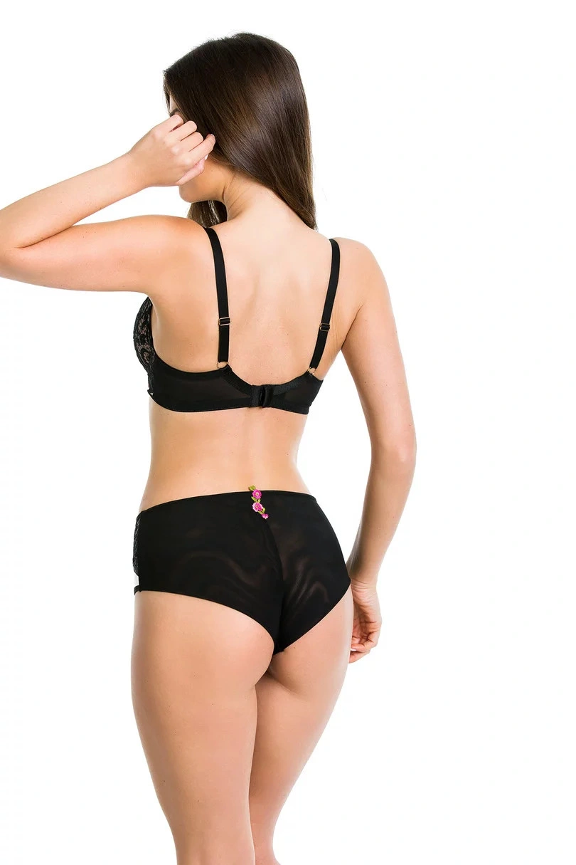 Górna linia modelu i mostek są ozdobione ładnym haftem z czerwonymi kwiatami. Paski są ozdobne. Model ma stabilny obwód i jest ozdobiony złotymi detalami. Biustonosz ma krój i konstrukcję odpowiednią dla kobiet o średnim i dużym biuście.