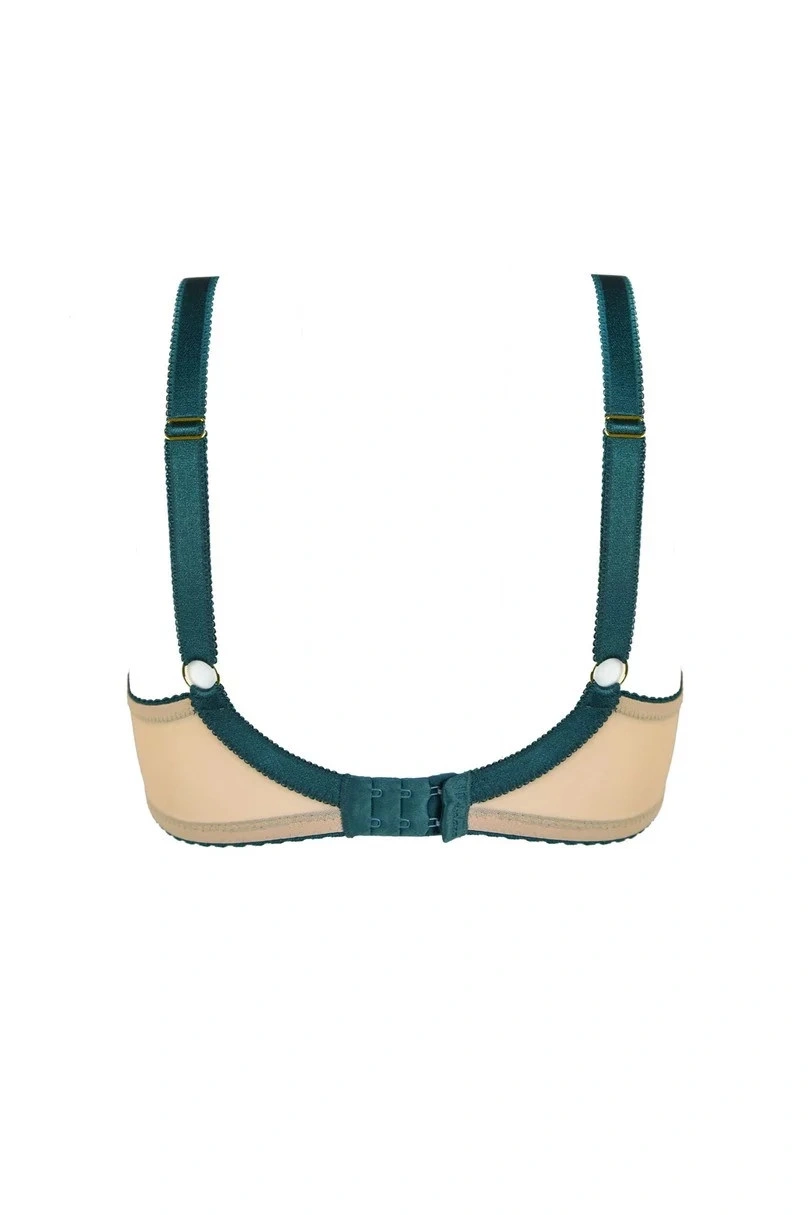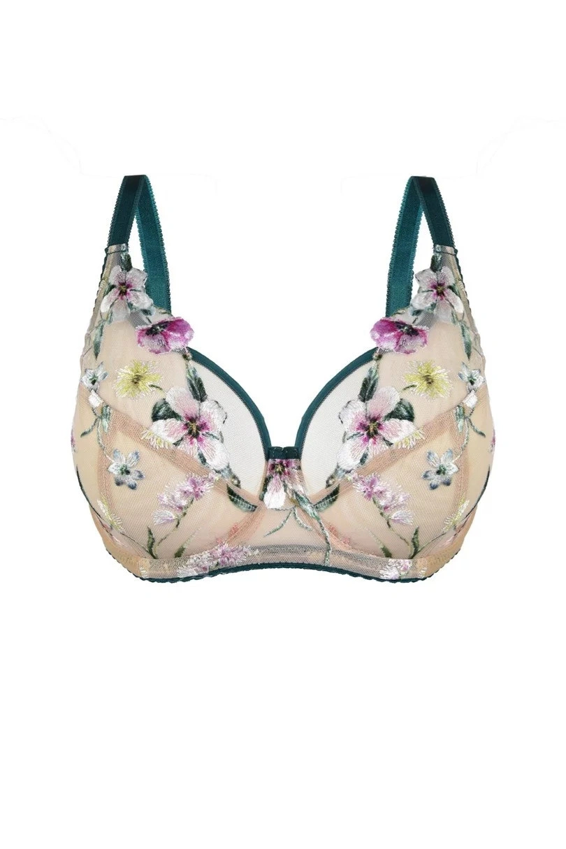 Trzyczęściowe miseczki dopasowują się do kształtu biustu i zapewniają doskonałe podtrzymanie.Koronka zdobi dolną i górną część miseczek.Błyszcząca nić subtelnie podkreśla brzegi.Środek zdobi mała zalotna kokardka.Ramiączka są mocno przytwierdzone do miseczek i można je regulować w zależności od potrzeb.Obwód wykonany z wytrzymałej elastycznej siateczki, nie posiada pionowych wzmocnień bocznych i doskonale się dopasowuje.