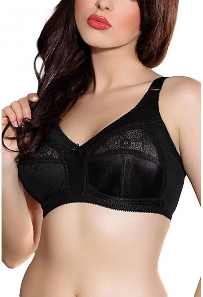 Biustonosz damski, nieusztywniany, bez fiszbin, grube ramiączka, zapięcie trzyrzędowe z tyłu.