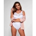 Biustonosz jest miękki, wygodny w noszeniu i ładnie otula biust. Model jest wykonany z siateczki i w połowie podszyty tkaniną. Górna linia modelu jest półprzezroczysta i ozdobiona efektownym haftem z motywem kwiatowym. Na połączeniu miseczek znajduje się satynowa kokardka i ozdobny element biżuteryjny. Wygodne szerokie ramiączka gwarantują komfort i wygodę noszenia.