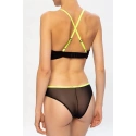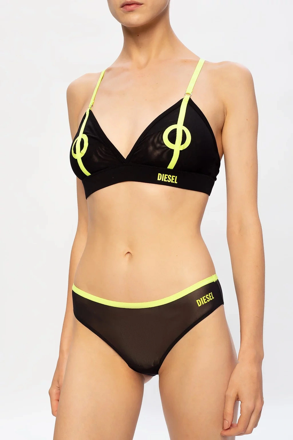 Czarno-zielony biustonosz marki Diesel. Ten model jest wykonany z półprzezroczystego elastycznego materiału i ma haftowane ramiączka z logo, ramiączka mają regulowaną wysokość.