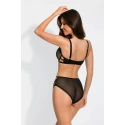 Miseczki wykonane są z miękkiej beżowej siateczki, której powierzchnia pokryta jest misternym czarnym haftem dodającym elegancji i dyskretnego uroku. Miseczki obszyte są silikonową lamówką, która zapewnia idealne dopasowanie. Ramiączka ozdobione są złotymi pierścieniami, które nadają biustonoszowi wyjątkowego charakteru.