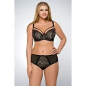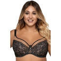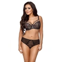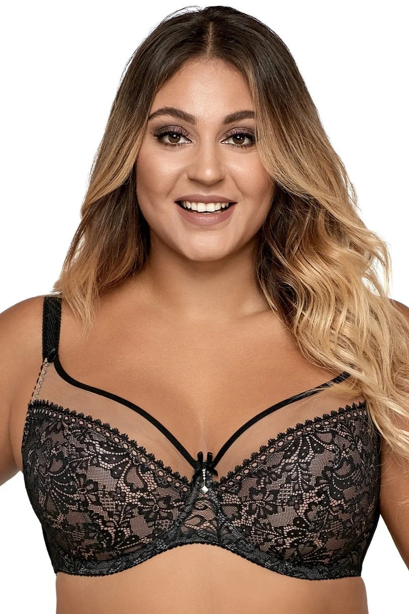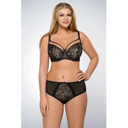 Miękki biustonosz. Górna część miseczki wykonana z beżowego tiulu. Między miseczkami ozdobny koralik. Boki wykonane z jednolitego materiału, ramiączka nieodpinane. Do kompletu dostępne majtki i stringi.