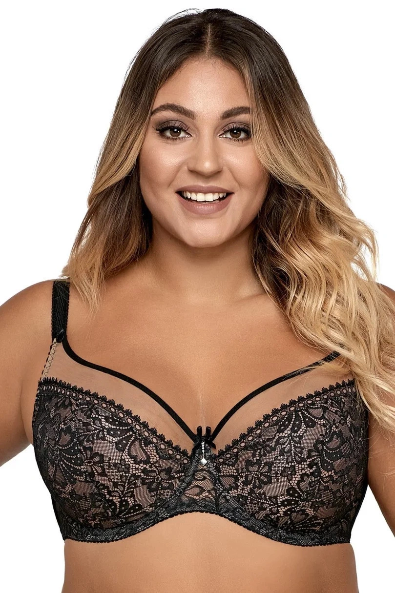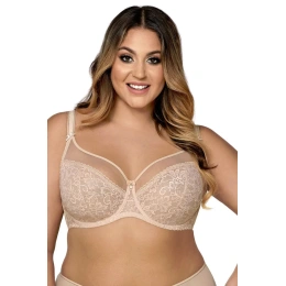 Miękki biustonosz. Górna część miseczek jest tiulowa, a dolna koronkowa. Pomiędzy miseczkami znajduje się ozdobny koralik. Boki są wykonane z solidnego materiału i są wzmocnione fiszbinami. Paski są regulowane i nie można ich odpiąć. Zapięcie z tyłu na metalowe haczyki.