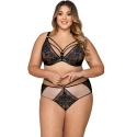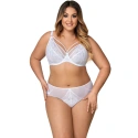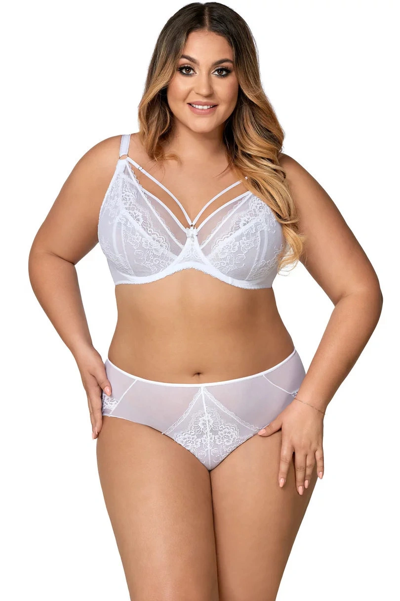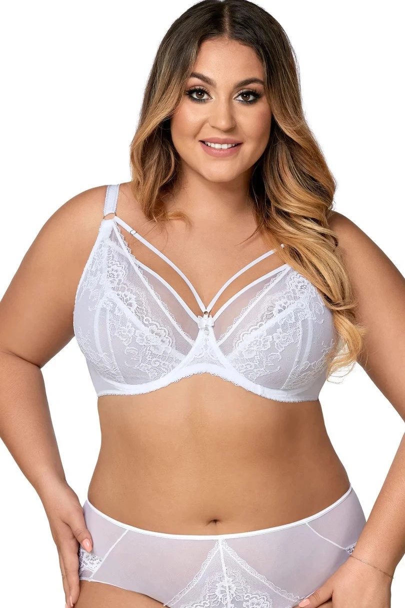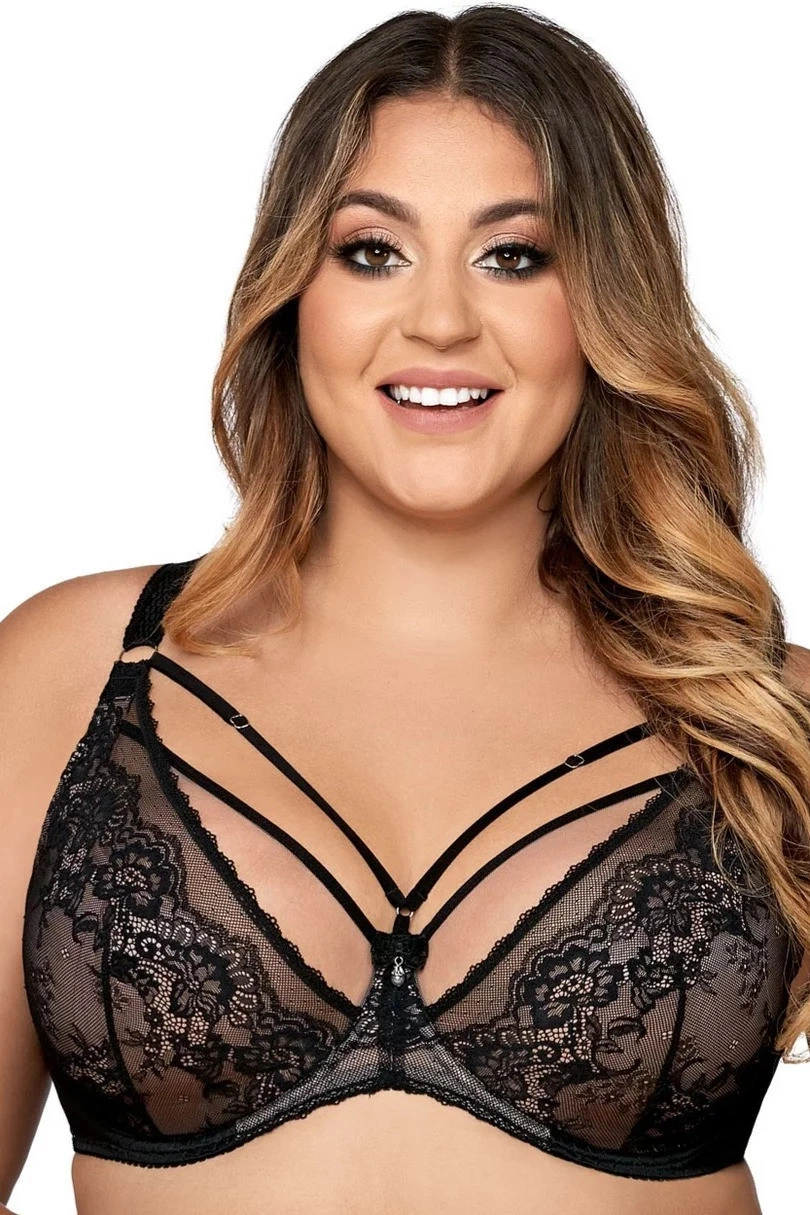 Piękny model miękkiego biustonosza wykonanego z koronkowego materiału. Miseczki i ich środek są ozdobione koronką i drobną siateczką. Górna linia dekoltu jest obszyta czarnym paskiem. Pomiędzy miseczkami znajduje się ozdobna kokarda z zawieszką. Paski można dowolnie regulować, ale nie można ich odpiąć. Obwód wykonany jest z elastycznej lycry. Mocowanie rozwiązano za pomocą klasycznych haczyków. Miękka faktura miseczek nadaje piersiom ładny, naturalny kształt. Dzięki oddychalności materiału nawet nie będziesz wiedzieć, że nosisz stanik. Wygodę gwarantuje idealne dopasowanie i maksymalne wyrafinowanie tego modelu. Ozdobne ramiączka w dekolcie są również regulowane.