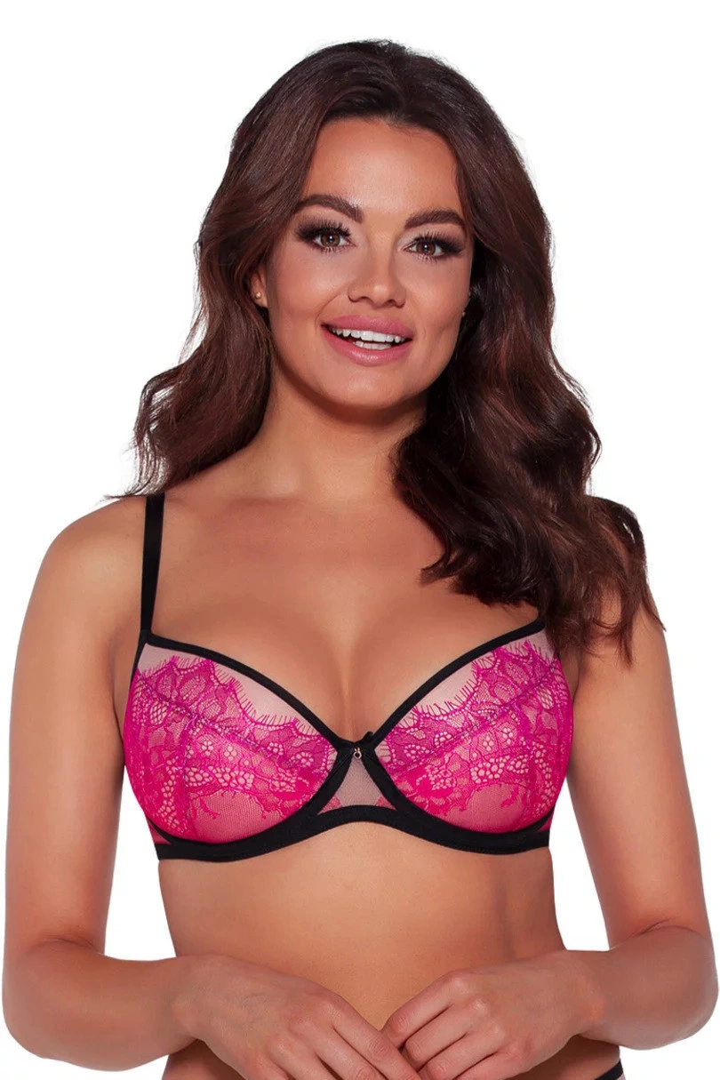 Energetyczny ró ż odzwierciedla kolor letniej aury, dlatego nie może go zabraknąć w wakacyjnej stylizacji. AV 2031 oferuje kontrastową kombinację kolorów - beżową piankę pokrytą cielistym tiulem i delikatną koronką, a wszystko to otoczone czarnymi ramiączkami. Biustonosz push-up odpowiednio podtrzymuje ponętnie uniesione piersi i kokieteryjnie odsłania je w dekolcie, a dziewczęca kokardka na styku piersi dodaje uroku. Zaufaj luksusowemu Ambre!