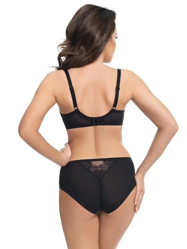 Biustonosz wykonany jest z czarnej siateczki i koronki. Pomiędzy miseczkami znajduje się srebrny element biżuteryjny. Kubki składają się z trzech części i są pokryte od wewnątrz bawełną. Model można uzupełnić o wkładki push-up. Boki biustonosza wykonane są z elastycznej siateczki i wzmocnione pionowymi fiszbinami, dzięki czemu nie odkształcają się podczas noszenia. Paski można regulować, ale nie można ich zdjąć.