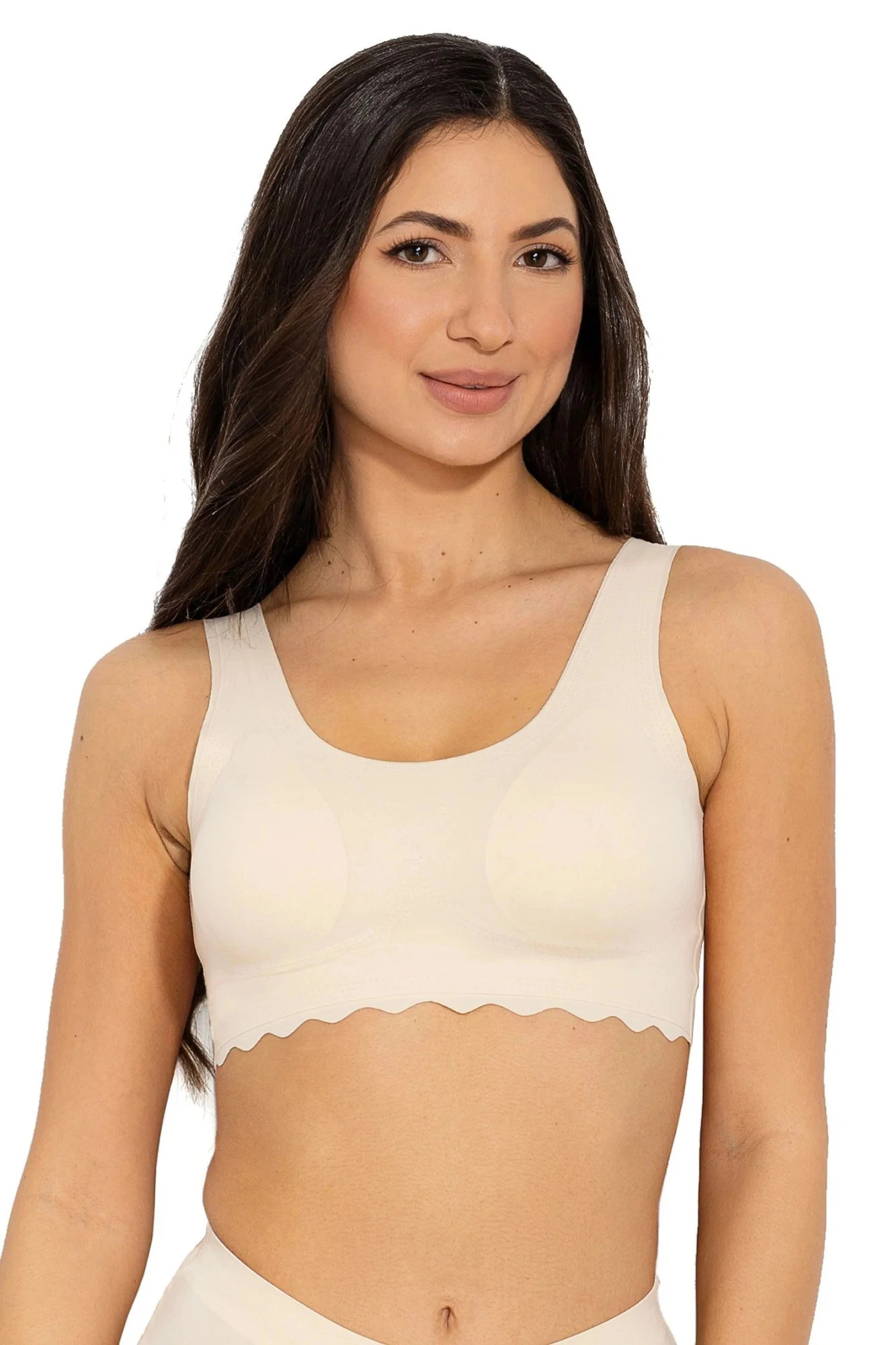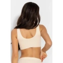 Biustonosz damski Feel Good beige MITEX - beżowy - typu bralette - wykonany z cienkiej bezszwowej dzianiny - uszyty w technologii Laser Cut - miękkie miseczki - wyjmowane lekko wzmocnione wkładki - wzmocniony elastyczny obwód - bez fiszbin - szerokie ramiączka - bez zapięcia - niewidoczny pod ubraniem