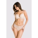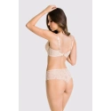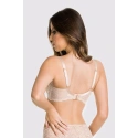 Wewnętrzna strona miseczek wykonana z beżowej pianki, górna strona z koronki, góra z tiulu. Miseczka połączona z ramiączkiem za pomocą stożka.