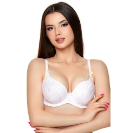 Biustonosz marki Jagoda. Model Nikola. Posiada druty modelujące biust. Pionowe fiszbiny boczne. Produkt posiada regulowane ramiączka bez możliwości odpięcia. Metalowe haftki przy ramiączku. Biustonosz zapinany na haftki. Miejsce zapięcia: z tyłu. Dwa rzędy pionowych haftek. Trzy poziomy haftek.