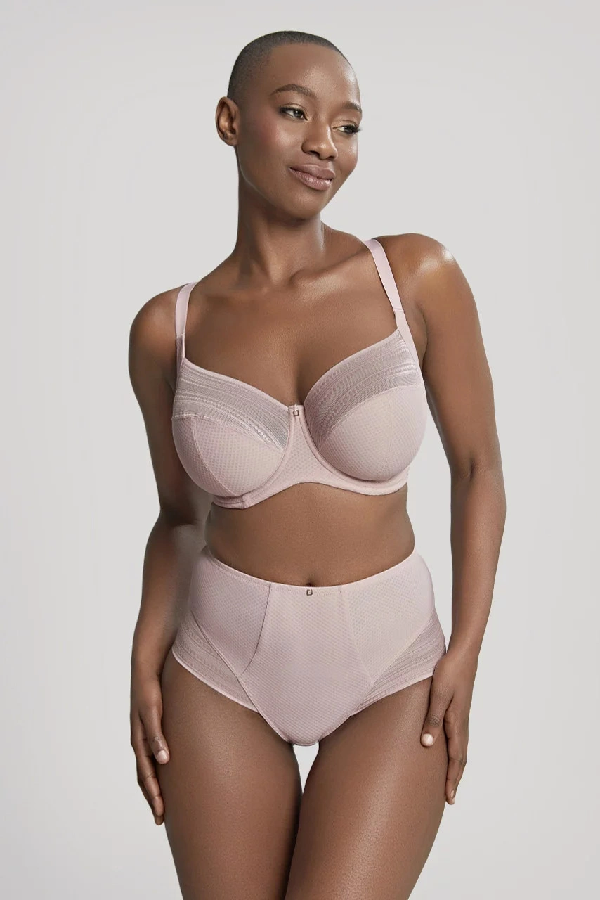 Nieusztywniany biustonosz Panache Serene oferuje podobne dopasowanie do naszego wieloletniego standardu, biustonosza Envy. Serene zachwyci Cię subtelnym geometrycznym wzorem, półprzezroczystym obszyciem wzdłuż dekoltu i regulowanymi ramiączkami, które można skrzyżować z tyłu. Ma uroczy elegancki wygląd, miseczki są nieprzezroczyste. Miseczka jest uszyta z 4 części i ma górną krawędź z elastycznej koronki. Boczne wsparcie zapewnia, że biust nie wychodzi poza sylwetkę. Biustonosz doskonale unosi i modeluje biust nawet w największych rozmiarach. Zapięcie jest wyściełane z tyłu dla maksymalnego komfortu. Obwód biustonosza ma ukryte szwy, dzięki czemu jest bardzo wygodny na ciele. W tym kolorze biustonosz pasuje pod jasne i białe ubrania. Zalecamy łączenie go z wyższymi majtkami w tej samej tonacji kolorystycznej i z identyczną elastyczną koronką.