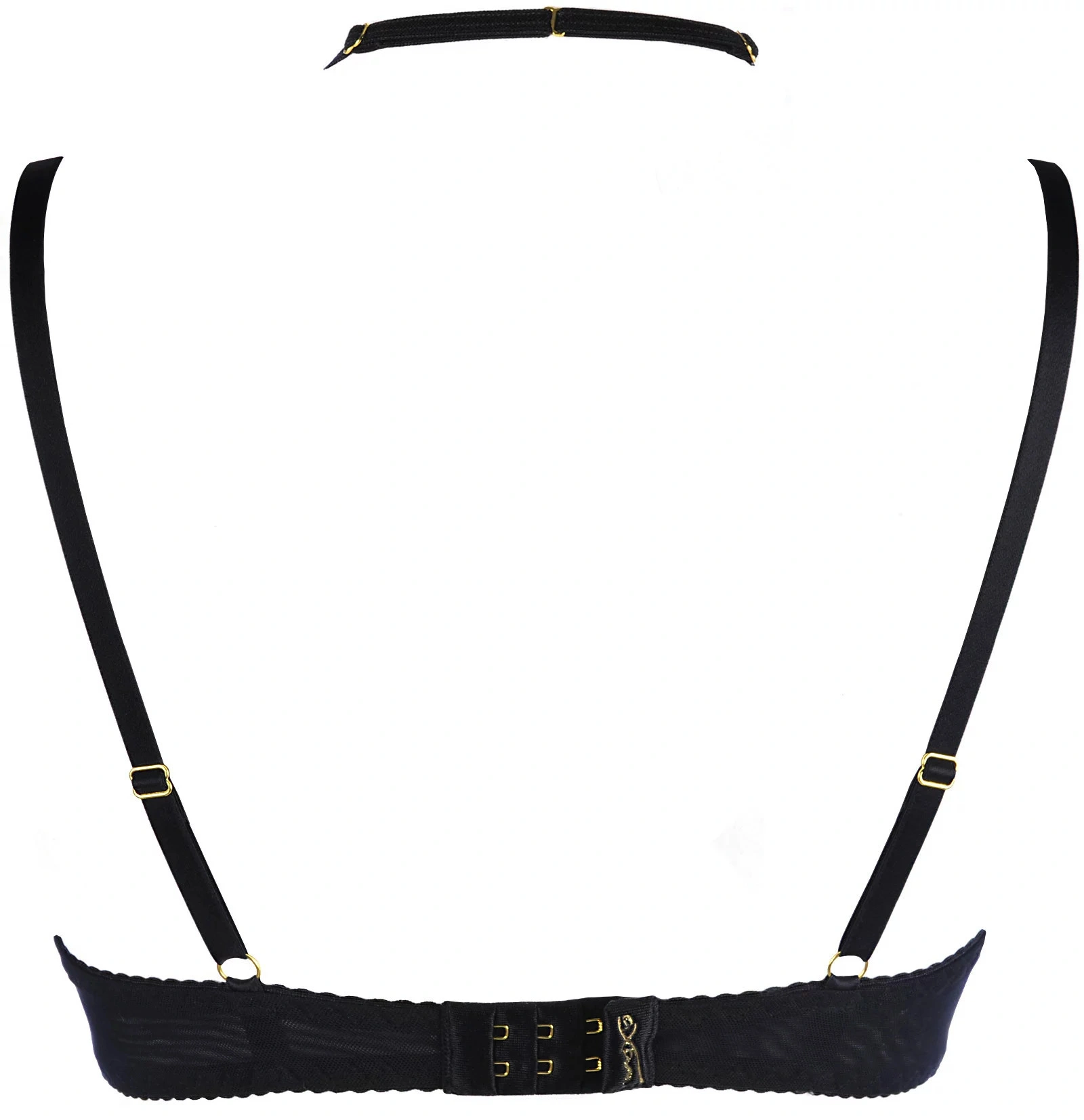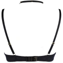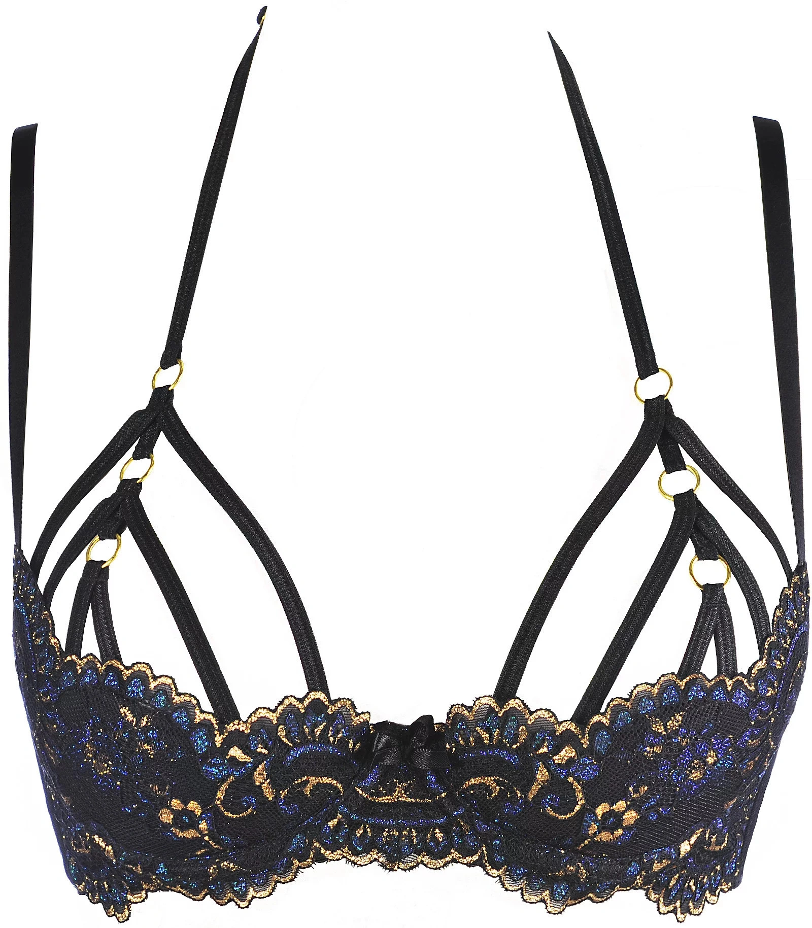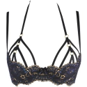 Pomysłowy i zjawiskowy model biustonosza, obok którego zdecydowanie nie można przejść obojętnie. Bogactwo niebieskiej i złotej koronki przeplata się z niezwykłym połyskiem, który mieni się i ujawnia nowe kolory przy każdym ruchu sylwetki. Model ma miękkie, niskie miseczki bez usztywnienia, usztywnienie z drutu i ozdobną kokardkę między piersiami. Model zapinany jest na dwurzędowe haftki z nieodpinanymi paskami, które można regulować. Model ma boczne panele z fiszbinami, a tył wykonany jest z solidnego czarnego tiulu.
