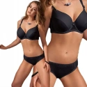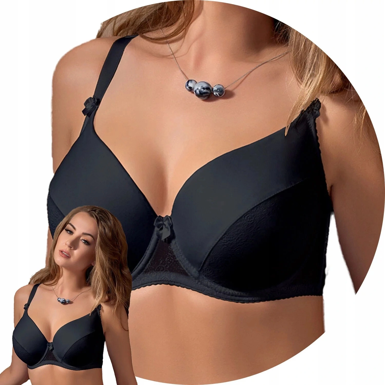 Biustonosz z fiszbinami i pełnymi miseczkami. Model dla pań, które preferują mocno wzmocnione, pełne miseczki obejmujące cały biust. Ozdobione dekoracyjną gładką koronką w dolnej części miseczek. Wierzch kubków gładki, jędrny. Motyle na mostku i paskach. Czterorzędowe zapięcie na dwa haczyki. Ramiączka biustonosza bez ramiączek są szerokie, nieodpinane i regulowane.