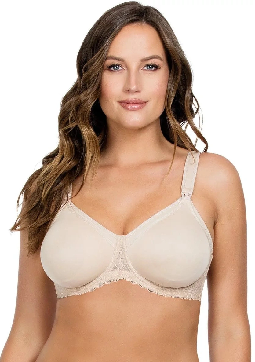 Idealnie miękki i gładki biustonosz do karmienia wykonany z delikatnego włókna dla matek karmiących piersią z lekkim i łatwym zapięciem miseczki podczas karmienia piersią. Zapięcie znajduje się w górnej części miseczki za pomocą prostego zatrzasku. Idealne dopasowanie i wyższy obwód biustonosza gwarantują wygodne noszenie przez cały dzień. Obwód biustonosza ma boczne elastyczne fiszbiny i jest ozdobiony delikatną regulowaną koronką. Ramiączka są ciasno uszyte, łatwo regulowane na długość, szersze i wyściełane z przodu, nie przecinają się i nie uciskają skóry. Zapięcie z tyłu na dwie haftki i cztery pozycje.