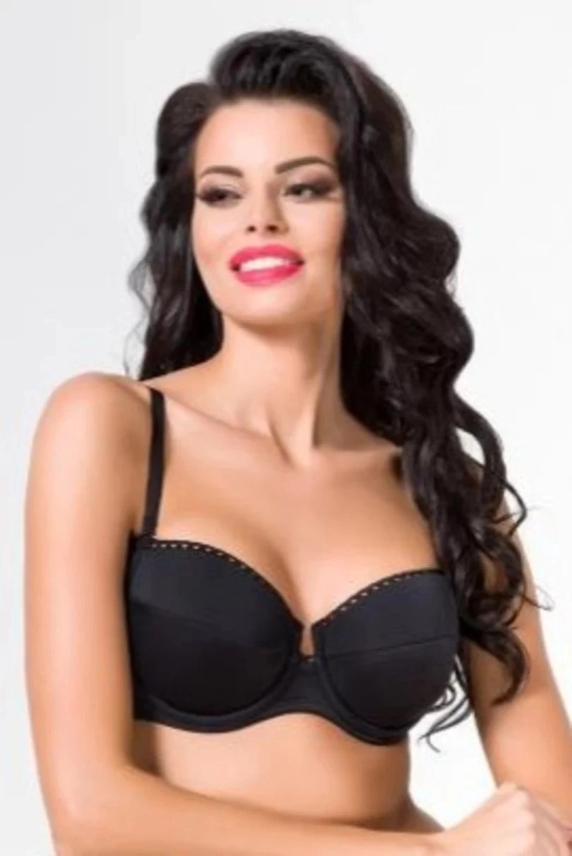 Biustonosz damski z fiszbinami i wzmocnionymi miseczkami. Ma klasyczny krój i odpinane ramiączka z regulacją. Przy dekolcie ozdobna lamówka. Tył i boki wykonane z gładkiego materiału. Z tyłu trzystopniowe zapięcie na dwie haftki.