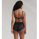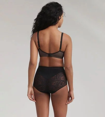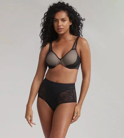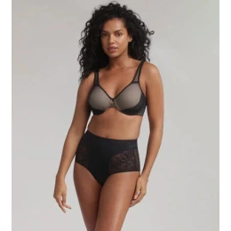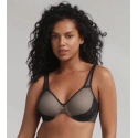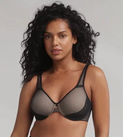 Biustonosz damski w kolorze cielistym, pokryty czarnym tiulem, w dolnej części miseczek naszyta luksusowa koronka. Ramiączka są przesuwane, zapinane z tyłu na dwa haczyki.