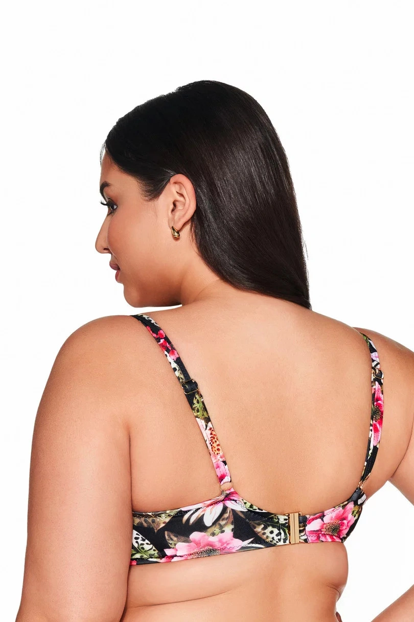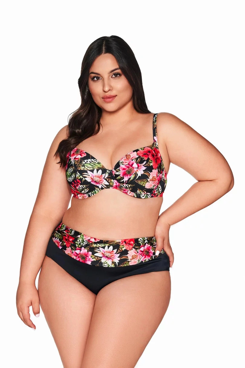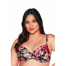 Biustonosz SK 219 SOFT to idealny wybór na letnie chwile, z tropikalnym wzorem w kwiaty i liście, ten biustonosz kąpielowy łączy w sobie wygodę i styl, dzięki czemu poczujesz się wyjątkowo na wakacjach.