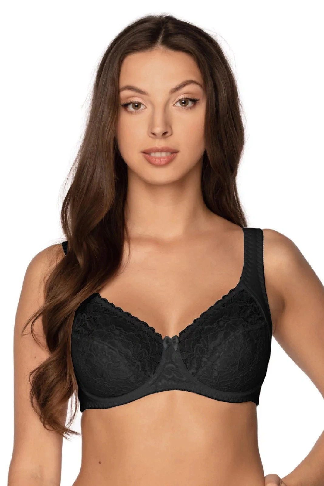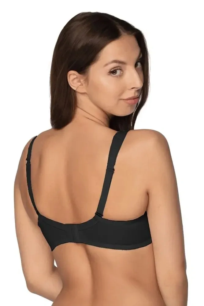 Dolna część miseczek jest podszyta materiałem. Górna część miseczek jest obszyta koronką. Model posiada boczny pas, który ładnie ściąga biust do połowy klatki piersiowej. Biustonosz zapinany jest na dwie lub trzy haftki z trzema opcjami regulacji obwodu. Model jest odpowiedni dla kobiet z większym biustem.