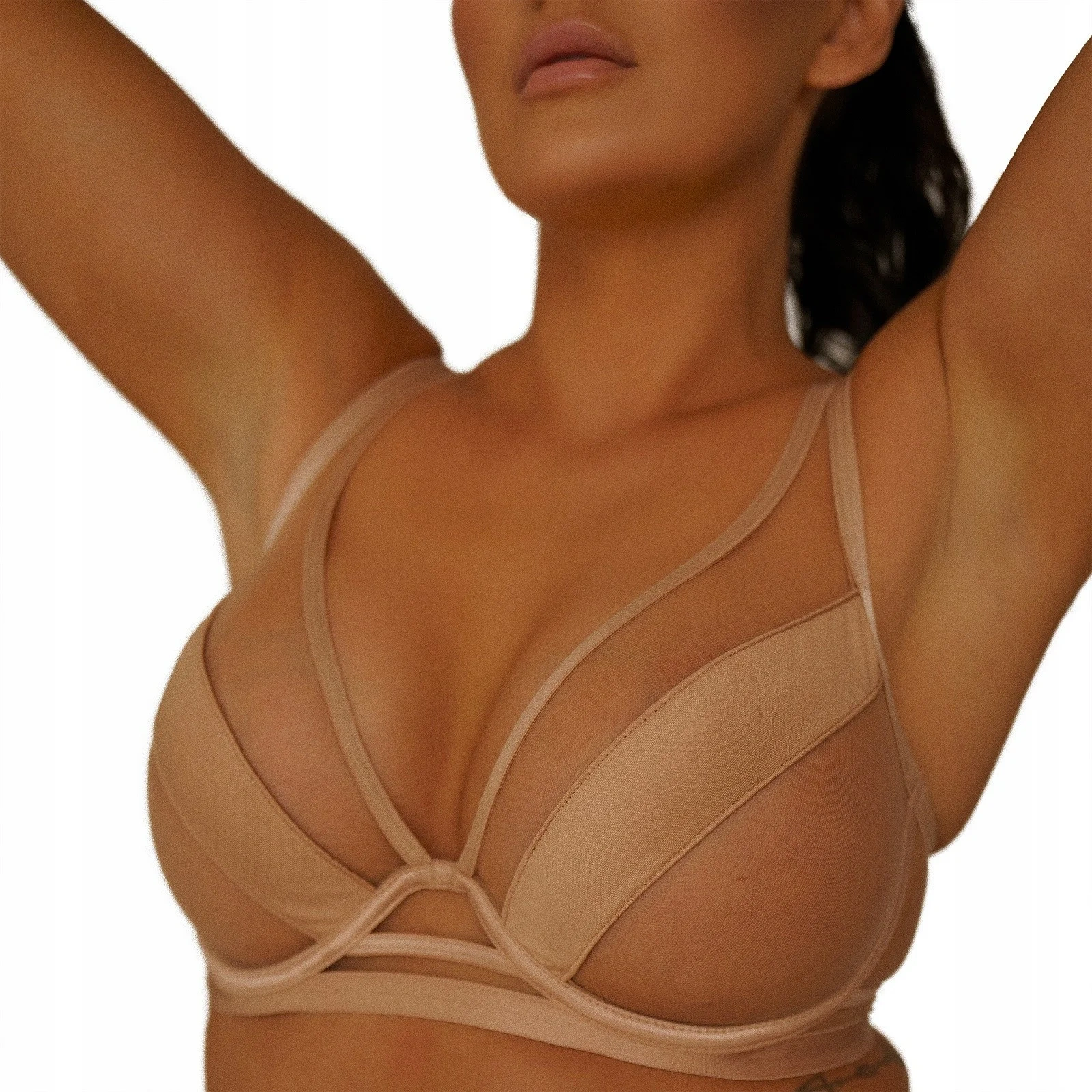 Biustonosz wykonany jest z beżowej siateczki. Miseczki ozdobione są miękką welurową wkładką. Paski można regulować, ale nie można ich zdjąć.