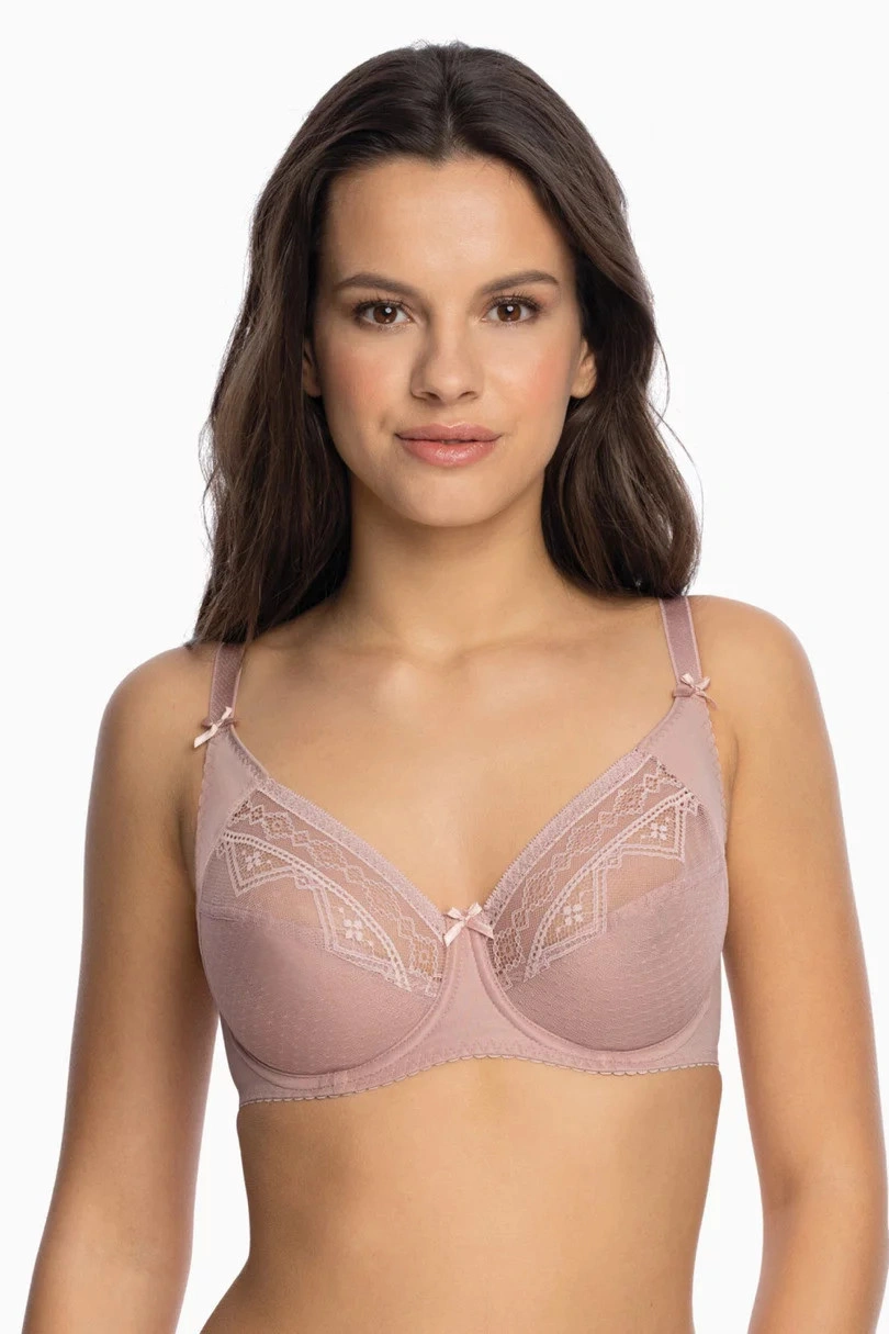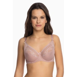 Miseczki wykonane są z koronki w geometryczne wzory. Konstrukcja i krój modelu doskonale otula i unosi biust dzięki bocznemu panelowi. Paski są wygodne. Obwód biustonosza jest wzmocniony bocznymi fiszbinami.