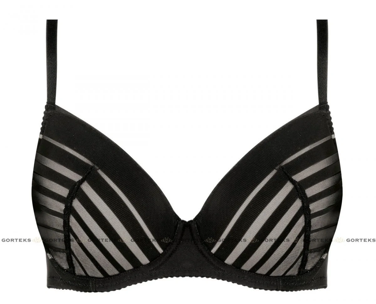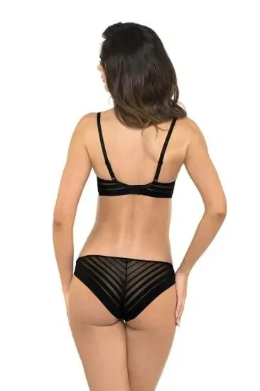 Miseczki są wzmocnione specjalną wyściółką, która jest przyjemnie elastyczna i dobrze dopasowuje się do kształtu ciała. Zewnętrzna strona pokryta jest delikatną tkaniną z wzorem, w eleganckim czarnym kolorze.