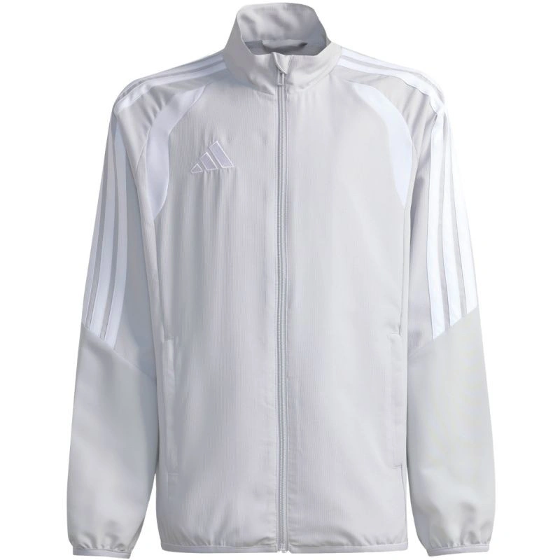 Bluza dla dzieci adidas Tiro 26 League Presentation jasnoszara JZ9053 Bluza dla dzieci adidas sprawdzi się podczas odpoczynku poza liniami boiska. Model z linii Tiro. Haftowane logo. Trzy paski. Konstrukcja wykonana z lekkiego materiału. Poliestrowe włókna pochodzą z recyklingu. Standardowy krój. Zamek na całej długości. Zapinane kieszenie boczne. Elastyczne mankiety. Materiał: 100% poliester z recyklingu