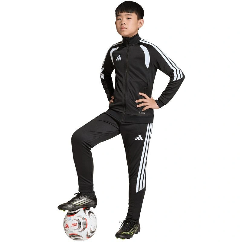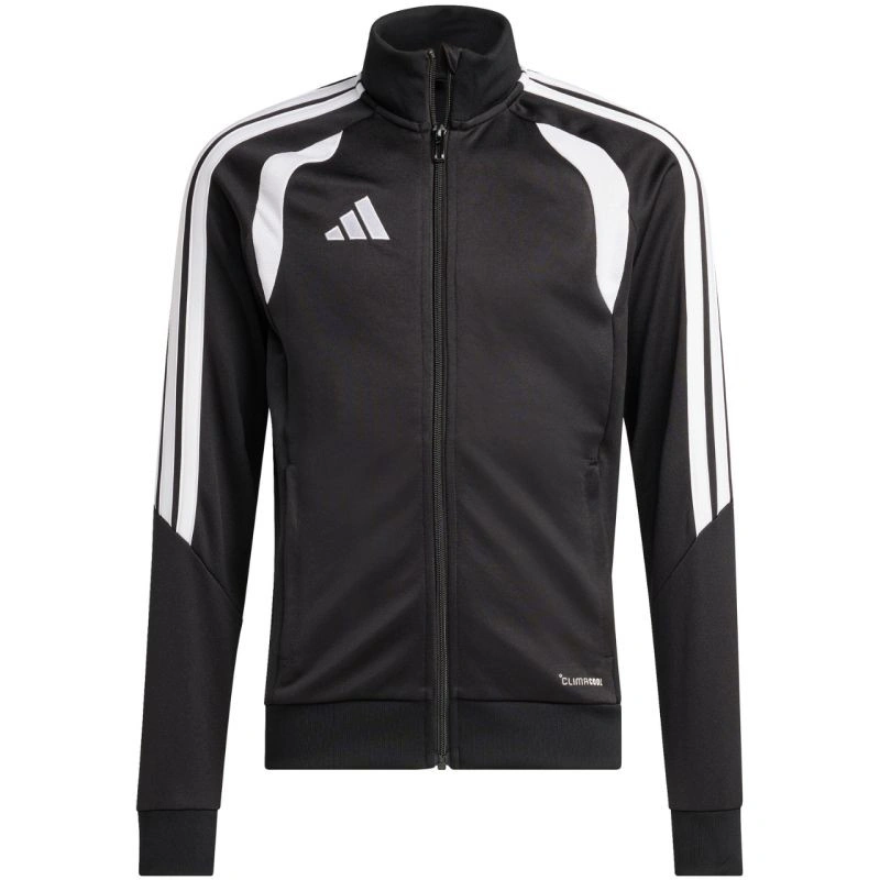 Bluza dla dzieci adidas Tiro 26 League Training czarna JY7202 Bluza piłkarska adidas przeznaczona dla dzieci sprawdzi się podczas treningów. Stójka. Zamek na całej długości. Dopasowany krój. Technologia Climacool odprowadza i rozprasza pot. Paski na rękawach. Subtelne logo. Szybkoschnące włókna. Materiał: 100% poliester z recyklingu