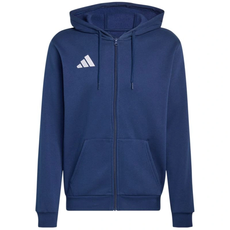 Bluza męska adidas Entrada 26 FZ Hoody granatowa KF5946 Bluza dla mężczyzn adidas sprawdzi się na co dzień. Miła w dotyku, bawełniana dzianina została połączona z poliestrowymi włóknami. Polarowe podszycie. Standardowy krój. Otwarte kieszenie boczne. Kaptur regulowany za pomocą sznurka. Elastyczne ściągacze przy rękawach i na dole. Niewielkie logo. Materiał: 70% bawełna, 30% poliester z recyklingu