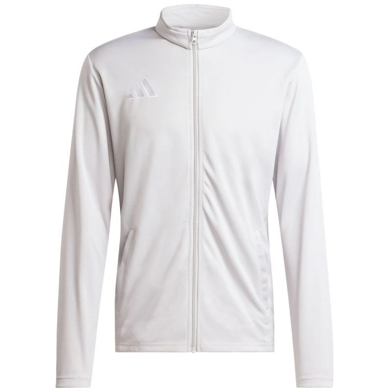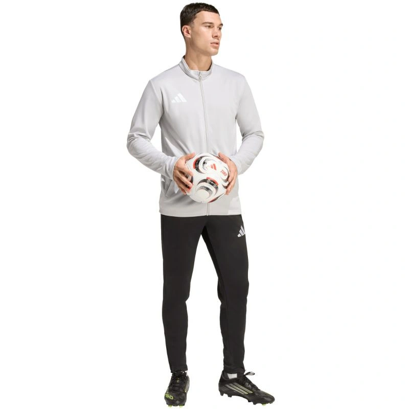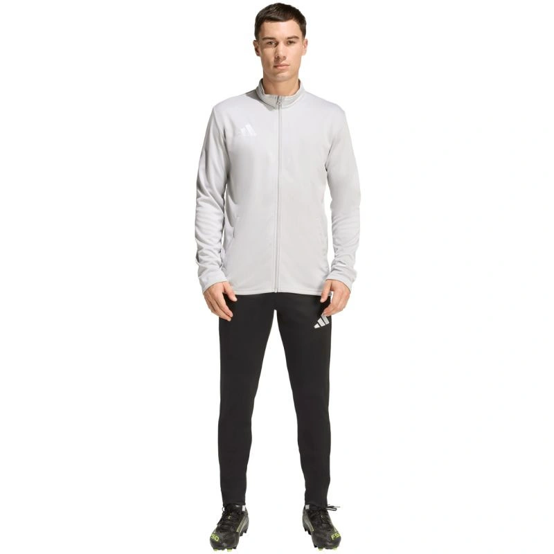 Bluza męska adidas Entrada 26 Track szara JZ6592 Bluza męska adidas sprawdzi się podczas treningów. Dopasowany krój. Zamek na całej długości. Technologia Climacool pochłania i odprowadza pot. Szybkoschnący materiał. Otwarte kieszenie boczne. Haftowane logo. Stójka. Materiał: 100% poliester z recyklingu