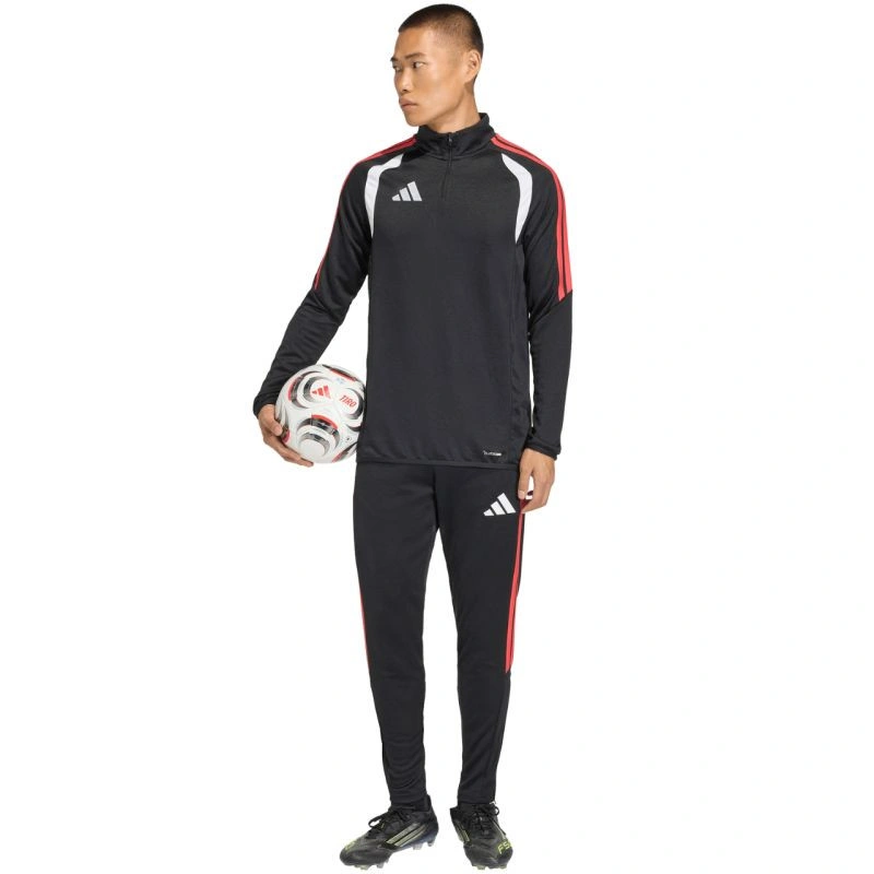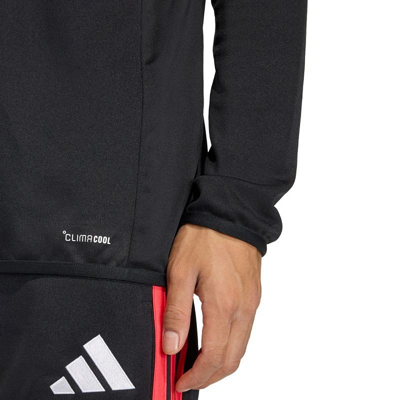Bluza męska adidas Tiro 26 League Training Top czarno-biało-czerwona JY9697 Bluza piłkarska adidas przeznaczona dla mężczyzn sprawdzi się podczas treningów. Wykończony patką chroniącą podbródek, krótki zamek. Dopasowany krój. Technologia Climacool jest funkcjonalnym rozwiązaniem, które zapewnia uczucie chłodu i suchości oraz skupienie na grze. Dół oraz mankiety wykończono elastyczną lamówką. Kontrastowe, siateczkowe wstawki. Paski na rękawach. Subtelne logo na piersi. Materiał: 100% poliester z recyklingu