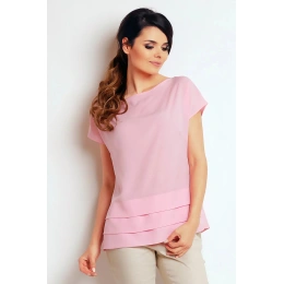 Ładna, prosta sukienka w jasnoróżowym kolorze ze stójką. Ozdobiona jest falbaną, która biegnie przez