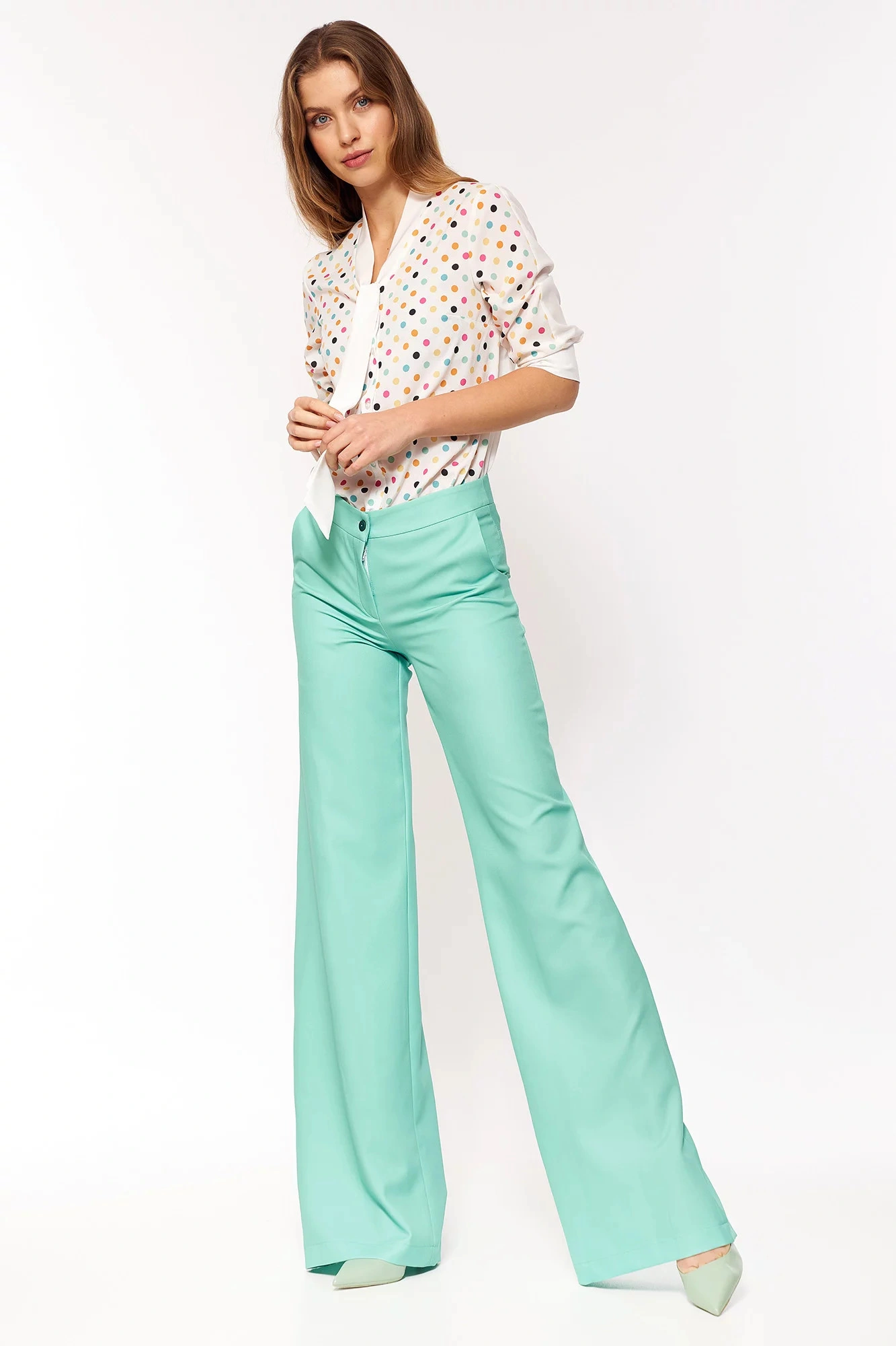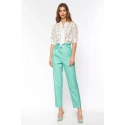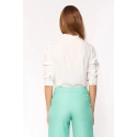 Dopasowana bluzka z zapięciem na guziki z przodu i dekoltem w szpic, zapięcie na guziki. Rękawy poniżej łokcia z mankietami zapinanymi na guziki. Nieprzezroczysty materiał.