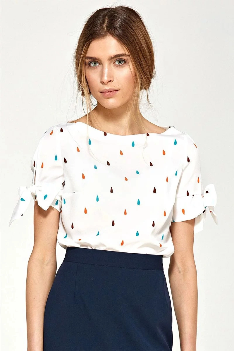 Dopasowana bluzka z zapięciem na guziki z przodu i dekoltem w szpic, zapięcie na guziki. Rękawy poni