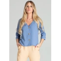 -niebieska krótka prosta bluzka z rękawami 3/4 i mankietem