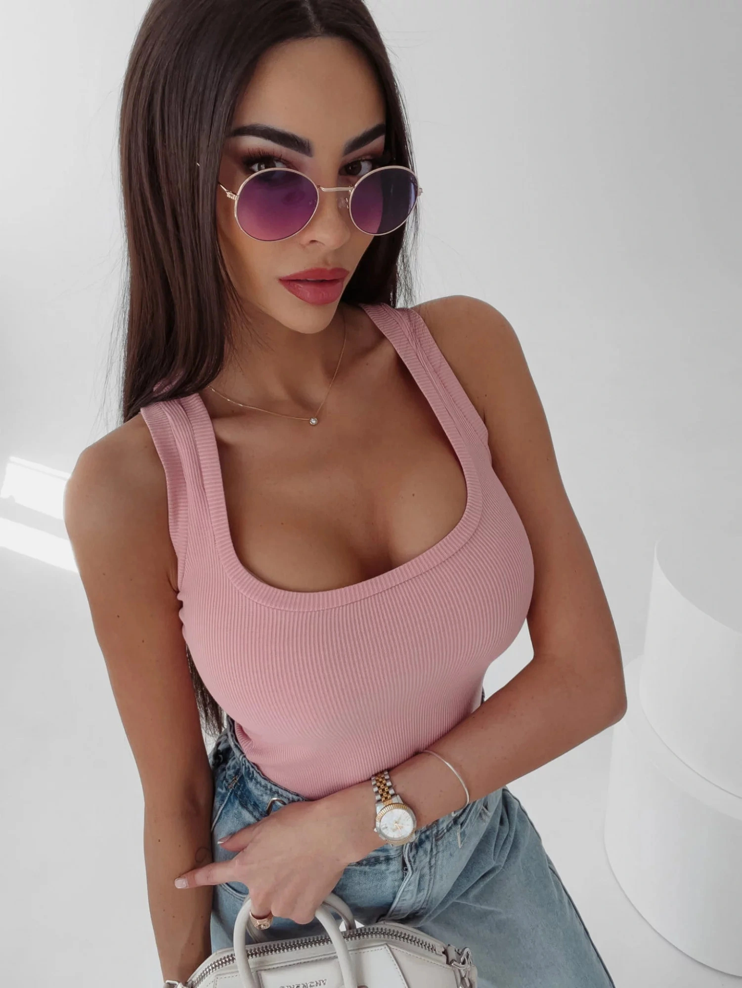 - model z kwadratowym dekoltem, który podkreśla biust.