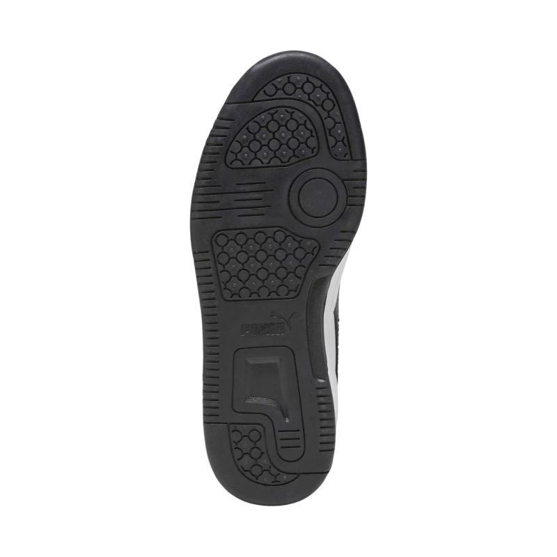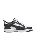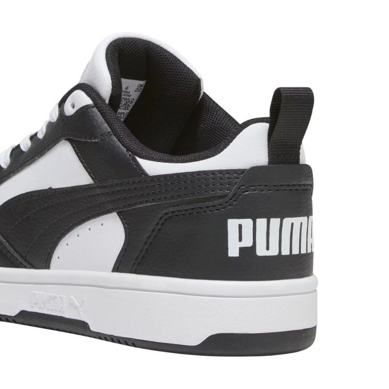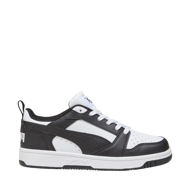 Buty dla dzieci Puma Rebound V6 Lo Mid biało-czarne 393833 01 Buty dla dzieci Puma to sprawdzony model na co dzień. Lekka cholewa ze skóry syntetycznej. Perforowane otwory. Klasyczne sznurowanie. Uchwyt na pięcie. Miękka wkładka SoftFoam+. Podeszwa zewnętrzna wykonana z wysokogatunkowego tworzywa.