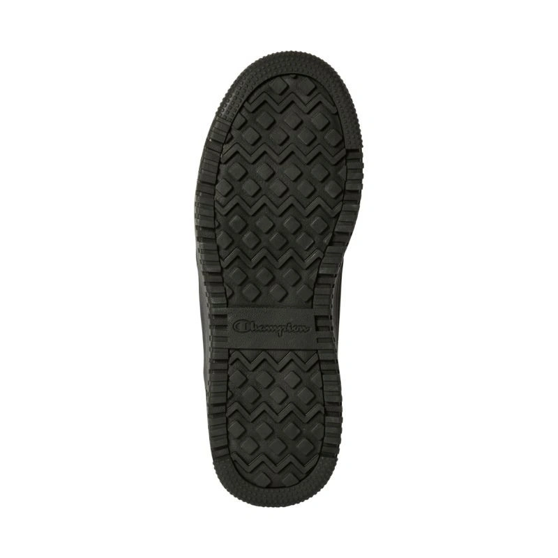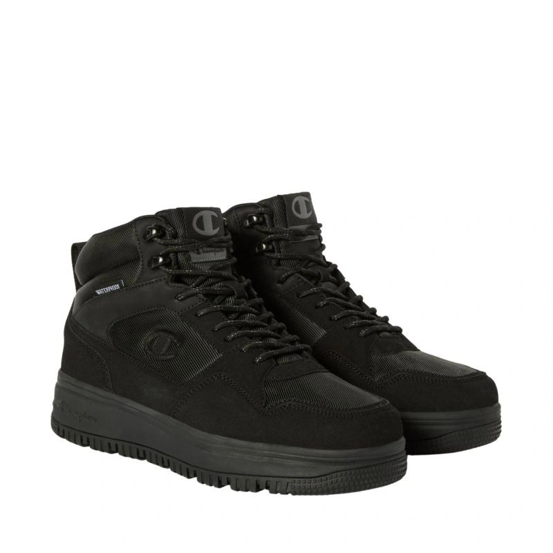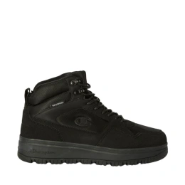 Buty męskie Champion RD18 Utility Wp Mid czarne S22298 KK002 Męskie buty Champion zadbają o ochronę przed chłodem w sezonie jesienno-zimowym. Podwyższona cholewka będąca połączeniem syntetycznych i tekstylnych materiałów. Wewnętrzna, wodoodporna membrana minimalizuje przedostawanie się wilgoci do wnętrza butów. Klasyczne sznurowanie z dodatkowymi haczykami. Miękko wyściełany kołnierz. Tekstylne wnętrze. Wewnętrzna wkładka wspiera amortyzację. Uchwyt w tylnej części. Gumowa podeszwa zewnętrzna z przyczepnym bieżnikiem. Logo ulokowane w kilku miejscach.