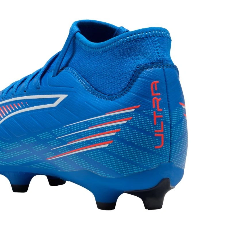 Buty piłkarskie Puma Ultra 6 Play+ FG/AG 108548 01 Podejmij piłkarskie wyzwanie, zakładając męskie korki Puma Ultra i wygraj kolejny mecz dzięki swojej szybkości. Rekreacyjne buty z premierowej kolekcji Untamed Pack. Syntetyczna cholewka z tłoczonymi elementami i elastycznym kołnierzem z dzianiny. Klasyczne sznurowanie. Standardowa konstrukcja języka. Podeszwa zewnętrzna Speedsystem łączy w sobie TPU oraz innowacyjny system kołków. Kołki FastTrax i bardziej zaokrąglone kołki po bokach przyczyniają się do bardzo dobrej przyczepności zarówno na naturalnej, jak i sztucznej trawie. Cholewka jest wykonana w co najmniej 30% z materiału pochodzącego z recyklingu.