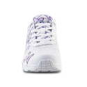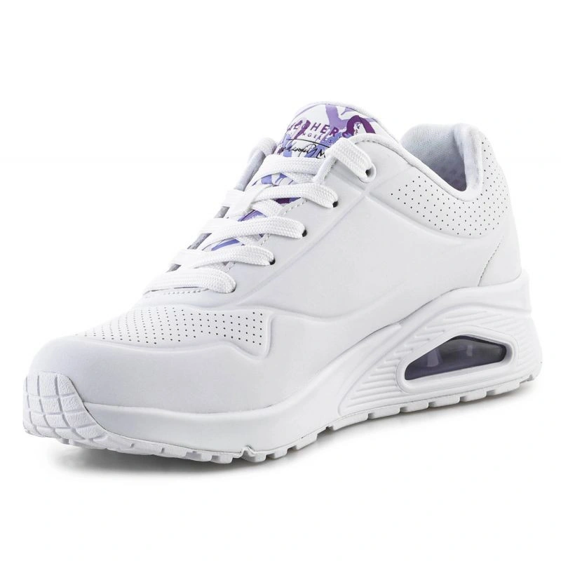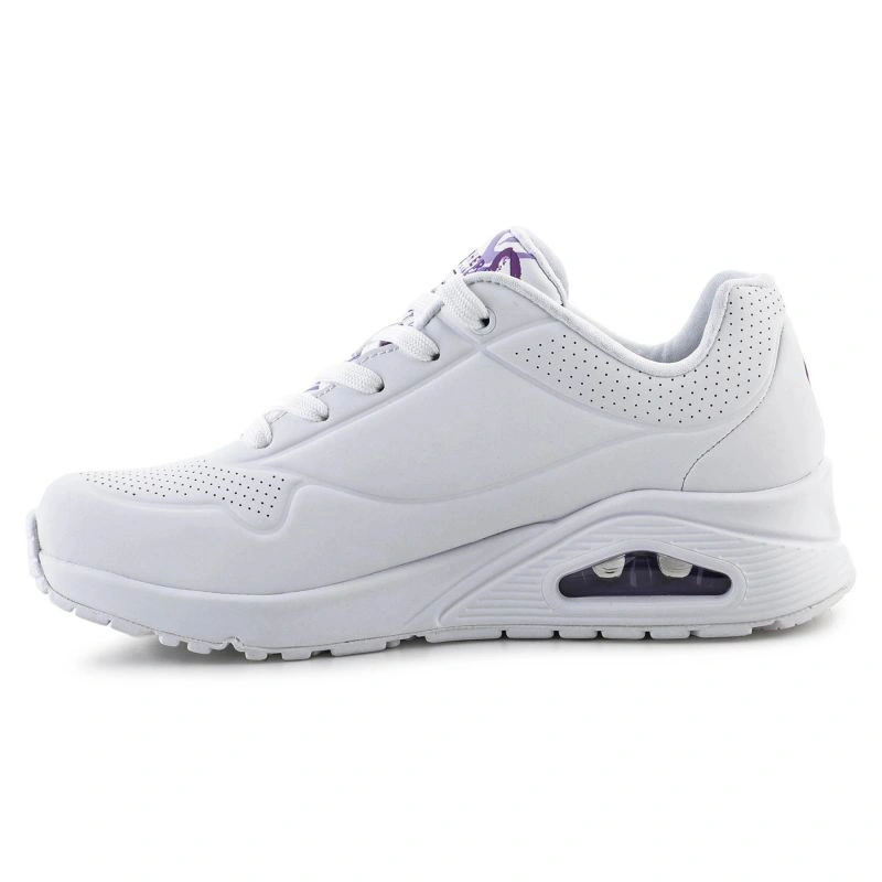 Właściwości: - Skechers JGoldcrown Uno Lite - Spread the Love 155507-WLPR to stylowy trampek o niskim profilu, który przyciąga wzrok dzięki barwnemu wzornictwu autorstwa znanego artysty JGoldcrown.