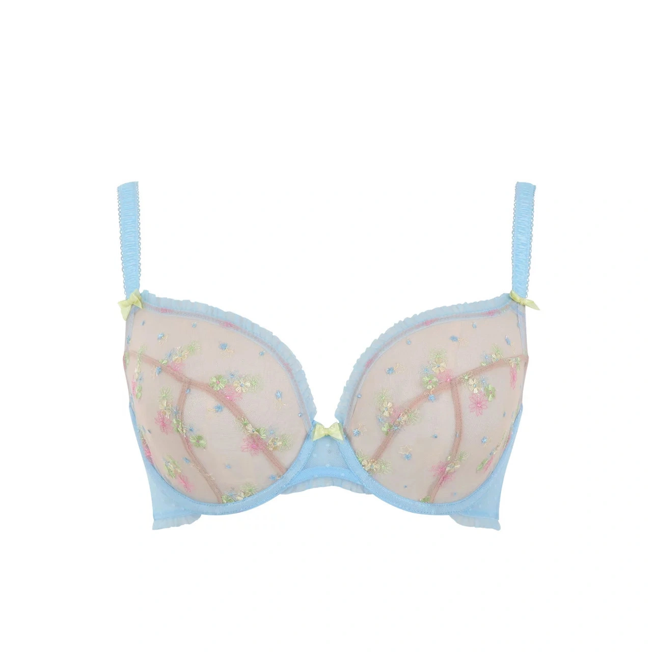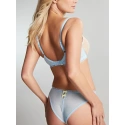 Misterny kwiatowy haft zapewnia wsparcie, a jednocześnie modny wygląd. Zmniejszone siedzisko na drutach dla mniejszego zakrycia i większego dekoltu, idealny głęboki kształtModne detale z siateczką w kropki i elastyczną falbanką.