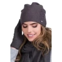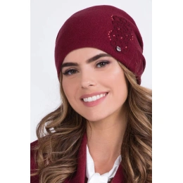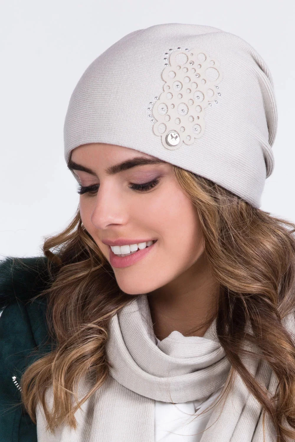 Czapka wykonana jest z ciepłej przędzy z dodatkiem wełny i jest idealnie dopasowana. Przód modelu ozdobiony jest delikatną aplikacją. Model jest dwuwarstwowy i posiada trzy zakładki z tyłu. Czapka jest doskonałym wyborem na chłodne dni.