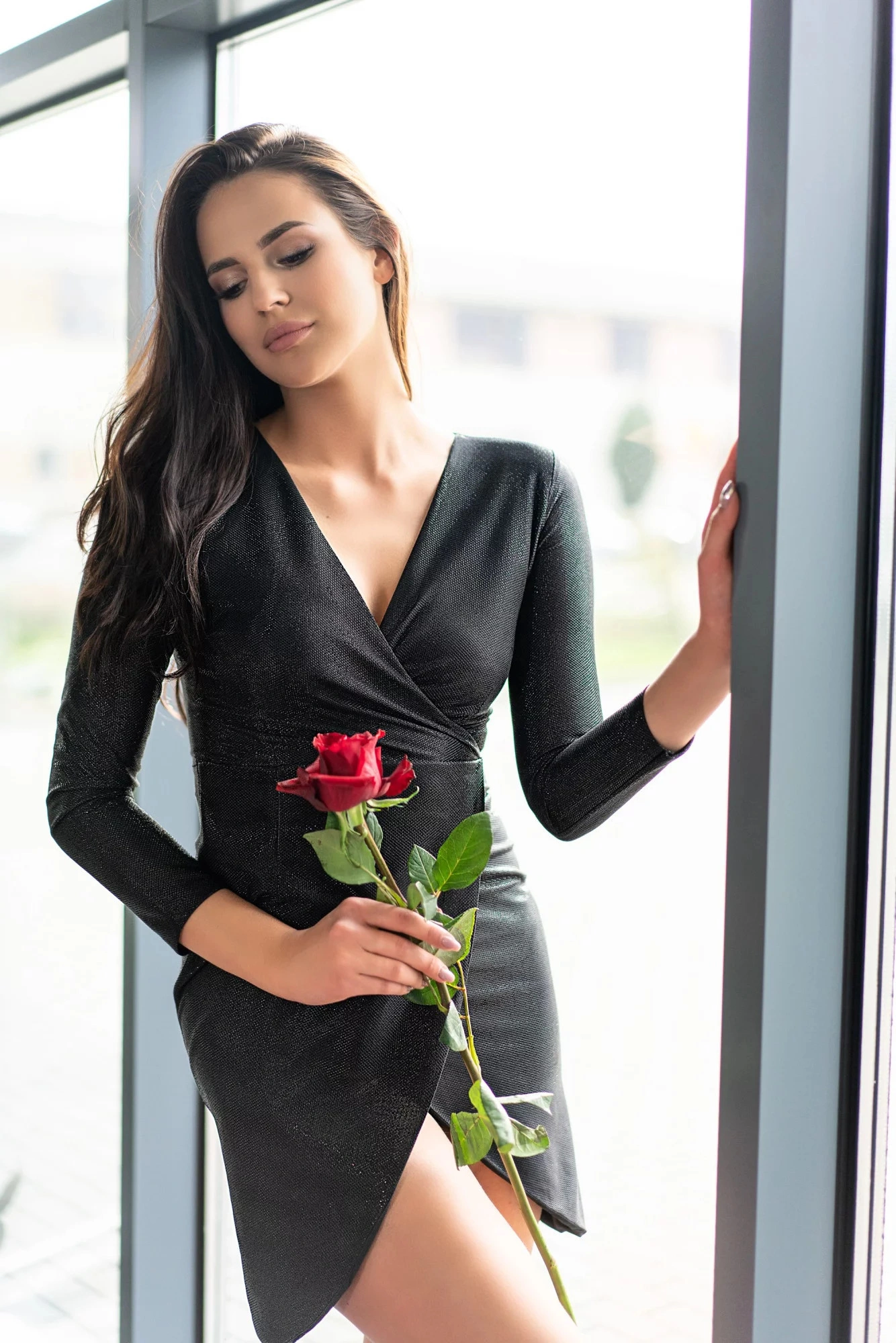 Dopasowana sukienka idealna na specjalne okazje, wykonana z miękkiej, elastycznej dzianiny. Seksowne dopasowanie zapewnia kopertowy dekolt i długość, która odważnie odsłania uda. Czarny, intensywny kolor. Skład materiału: 95% poliester, 5% elastan