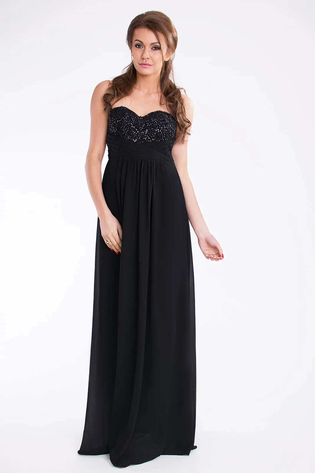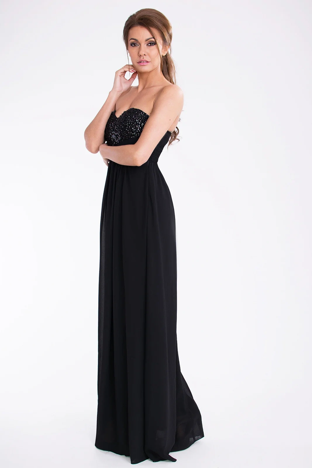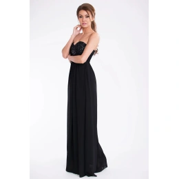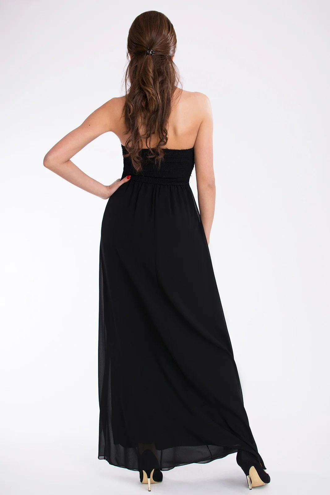 Zamek błyskawiczny z boku. Tył sukienki ma elastyczne żabki. Sukienka może być noszona bez ramiączek lub z ramiączkami, które są dołączone do sukienki.