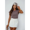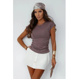 Minimalistická a zároveň ženská, tato jednoduchá tričko s krátkým rukávem je skvělou volbou na každý den. Klasický, kulatý výstřih jemně zdůrazňuje linii krku a jemné záhyby na bocích dodávají lehkost a jemný stylizovaný akcent. Vyrobená z měkkého, příjemného na dotek materiálu se skvěle přizpůsobuje postavě a poskytuje pohodlí po celý den. Ideální k džínům, sukničkám nebo kraťasům, hodí se jak do každodenních, tak trochu elegantnějších outfitů.