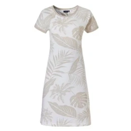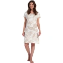 Damska koszula nocna bez rękawów od Pastunette z jasnobrązowym nadrukiem liści na białym tle.koszula nocna ma okrągły dekolt i długość 95 centymetrów.